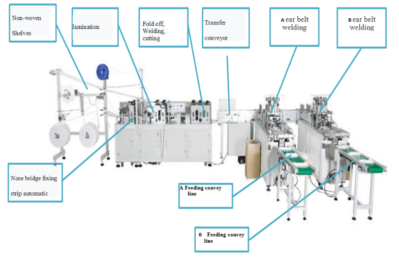 The automatic plane mask machine is mainly used for the automatic production and molding of disposable non-woven masks. This machine is developed using state- of-the- art high technology in cooper-ation with professional engineers. It is a mask making equipment widely rec-ognized for its high production speed, high stability and full configurations.What the operator need do is putting the raw materials on the feeder, after completing all settings, let the machine run automatically. It realizes virtual full-process automatically production, except packaging process which re-quires only 1 worker.